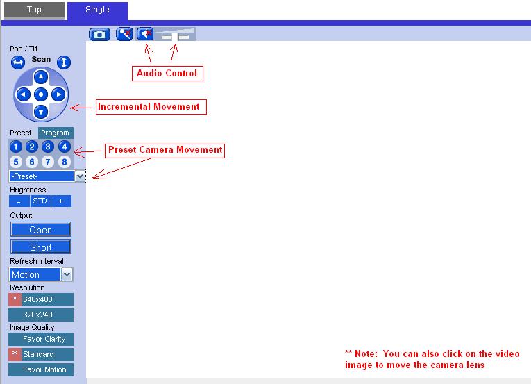 From there it will take a few seconds to install the software and soon you should see a live picture. If you want to hear audio, then adjust the little slider bar that’s above the top of the video all the way to the right and make sure you volume is up on your computer. The audio will mute each time the lens is moved. To move the camera lens, either click on the image itself to where you want the camera lens to move, or use the numbered buttons on the left. Using the arrows (up/down, left/right) can take forever to make the camera move anywhere because it’s incremental movement whereas clicking on the image itself will move many increments at one time.